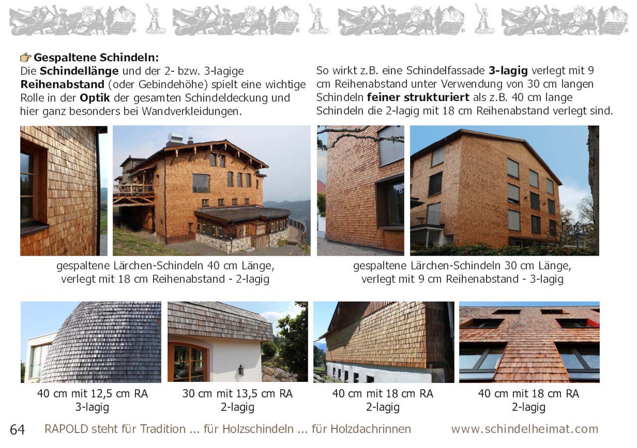 Gespaltene Schindeln: Die Schindellänge und der 2- bzw. 3-lagige Reihenabstand (oder Gebindehöhe) spielt eine wichtige Rolle in der Optik der gesamten Schindeldeckung und hier ganz besonders bei Wandverkleidungen. So wirkt z.B. eine Schindelfassade 3-lagig verlegt mit 9 cm Reihenabstand unter Verwendung von 30 cm langen Schindeln feiner strukturiert als z.B. 40 cm lange Schindeln die 2-lagig mit 18 cm Reihenabstand verlegt sind. gespaltene Lärchen-Schindeln 40 cm Länge, verlegt mit 18 cm Reihenabstand - 2-lagig gespaltene Lärchen-Schindeln 30 cm Länge, verlegt mit 9 cm Reihenabstand - 3-lagig 40 cm mit 12,5 cm RA 3-lagig 30 cm mit 13,5 cm RA 2-lagig 40 cm mit 18 cm RA 2-lagig 64 RAPOLD steht für Tradition ... für Holzschindeln ... für Holzdachrinnen 40 cm mit 18 cm RA 2-lagig www.schindelheimat.com